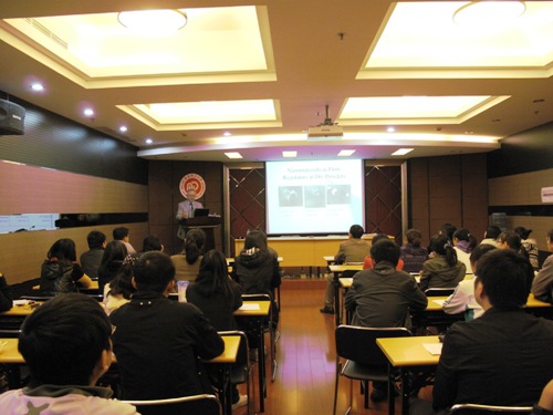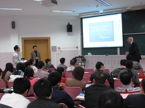 Zimmermann教授的首场报告从药物发现、临床前研究、临床研究和上市注册等几个环节详细介绍了新药从发现到上市的流程。详细剖析了各个环节可能存在的问题,并就如何减少药物研发成本、提高药物开发成功率提出了许多有借鉴意义的思路。第二场报告中,Zimmermann教授展示了不同规格的硅胶等材料对纳米微粒性能的影响,并展望了纳米材料在药物制剂方面的未来发展。报告结束后,Zimmermann教授与在座师生就药物研发的热点问题进行交流,教授言谈风趣,讲解耐心,会场气氛十分热烈。
