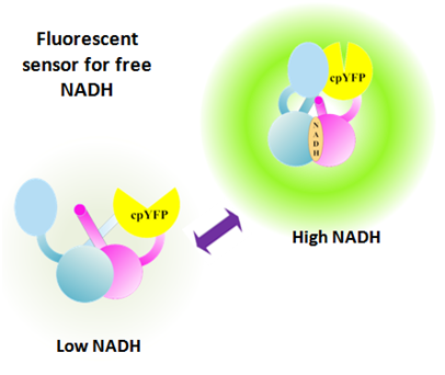 还原型烟酰胺腺嘌呤二核苷酸(NADH)及其氧化型(NAD+)是生物体内最重要的辅酶,广泛参与了细胞内的物质、能量代谢,信号转导与基因调控,与癌症、心血管疾病、糖尿病、神经退行性疾病等许多人类重要疾病关系密切。杨弋教授课题组利用合成生物学方法,开发了一系列的检测NADH的遗传编码荧光探针,在国际上首次实现了在活细胞及各种亚细胞结构中对NADH分子的实时动态、特异性的检测与成像。由于NADH在代谢和信号转导中的中心作用及其在疾病诊疗中的重要性,对组织与细胞内NADH的分布进行生物成像将为人们更好地了解物质与能量代谢的调节机制提供重要的创新工具与手段。