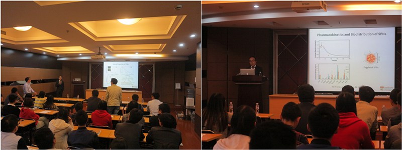 浦侃裔教授详细地介绍了他在应用半导体有机聚合物纳米粒子探针在检测活体动物中活性氧方面取得的最新研究进展。内容精彩有趣,与会师生全神贯注,仔细聆听。报告后师生们积极提问,浦教授详细解答,不时获得热烈掌声。