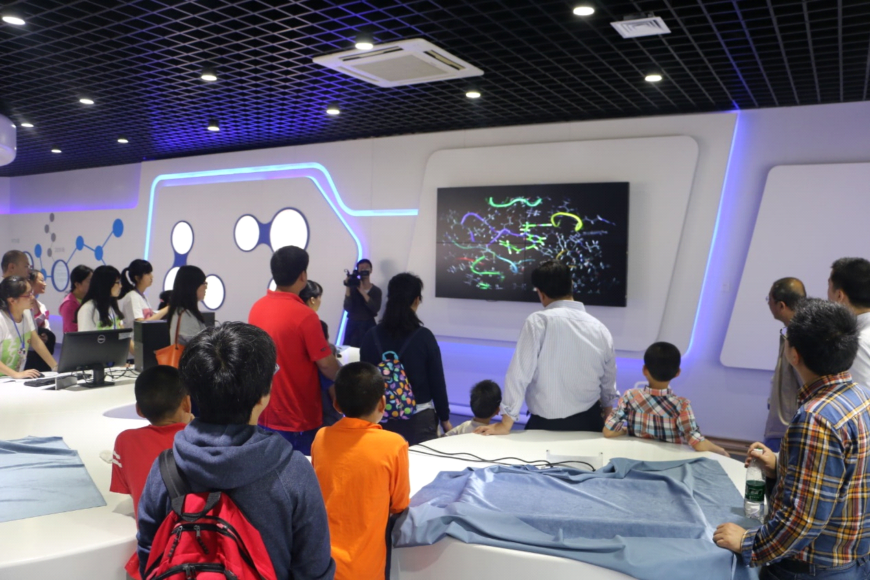 在计算机辅助药物设计平台前,志愿者们展示了计算机技术对于药物设计的重要辅助作用。观看了“蛋白质对接”等一些反应原理视频,孩子们在志愿者的指导下兴致勃勃地开始了分子结构的设计,一个个新奇的分子在孩子们充满想象的头脑中诞生,并通过电脑屏幕展现在我们眼前。大家也意识到现代药物的发展不仅是在瓶瓶罐罐间不停操作的双手,更需要不断发展地新型科技的参与