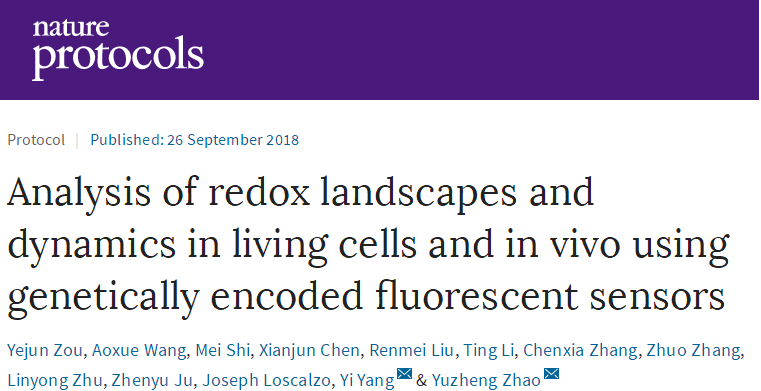 杨弋教授、赵玉政教授课题组的研究成果:“Analysis of redox landscapes and dynamics in living cells and in vivo using genetically encoded fluorescent sensors”。