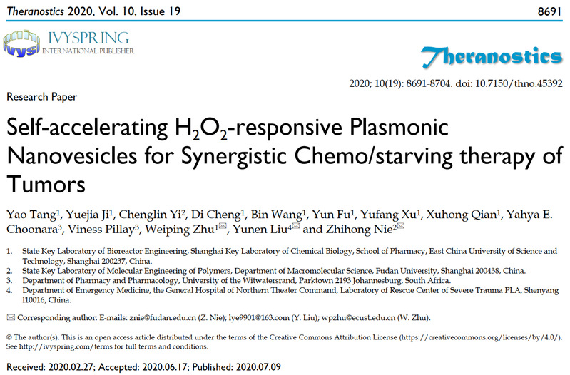 朱维平教授创新发展了一种自加速过氧化氢刺激响应型金纳米囊泡,实现了对小鼠肿瘤化疗和饥饿治疗的协同治疗,相关成果以“Self-accelerating H2O2-responsive plasmonic nanovesicles for synergistic chemo/starving therapy of tumors”为题,发表在生物医学杂志《Theranostics》上(Theranostics, 2020, 10 (19): 8691-8704)。