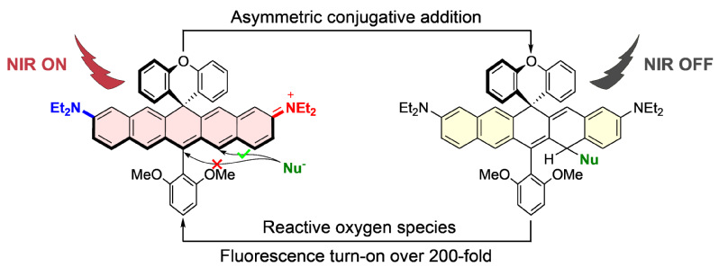 利用荧光成像技术在活体层面进行大深度、高精度的时空动态成像是目前生物成像的前沿方向。超过800 nm的近红外光对比起可见光,受到生物组织的散射、吸收和自体荧光的干扰更小,有利于提升成像的穿透深度和对比度,是活体成像的理想光学窗口。但领域缺乏兼具高信噪比、优异的组织穿透深度及长期稳定性成像的近红外荧光探针。这是由于激活型探针的开发,普遍受限于近红外荧光母核自身亮度低、光/化学稳定性差及探针检测灵敏度不够、激活信背比不高等问题。此外,适用于近红外荧光母核的光谱调控策略也十分有限。