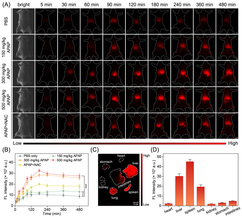在活体生物传感中,用EC5-H3监测药物诱导急性肝损伤小鼠的肝脏处活性氧变化,成像结果显示,损伤组的小鼠肝脏区域的近红外荧光强度呈现显著的剂量依赖和时间依赖性,且荧光发射可被抗氧化剂抑制。值得注意的是,EC5-H3在8小时后依然保持较高的成像亮度,这有利于后续肝脏氧化损伤的长时程、高分辨、可视化影像分析。