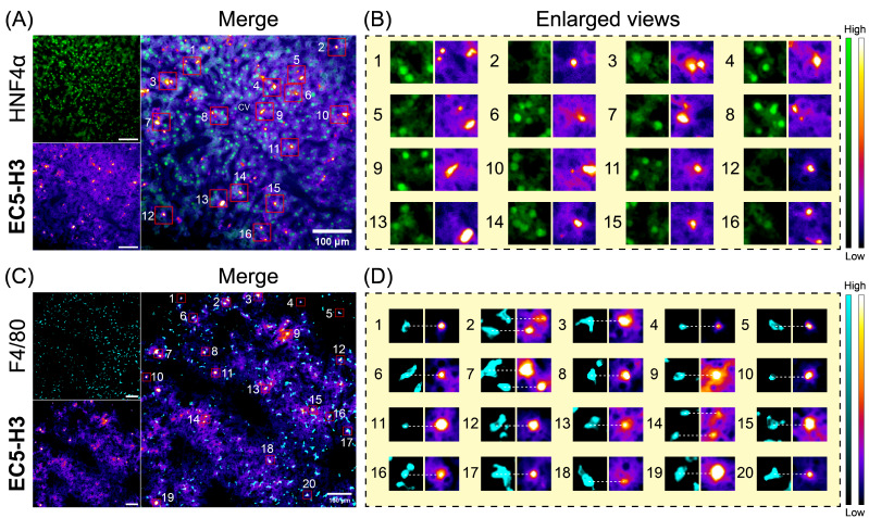 进一步利用近红外共聚焦显微镜观察损伤组小鼠的肝脏,发现对比起肝实质细胞,EC5-H3的高强度斑点状信号与巨噬细胞亚群有更好的重叠,表明肝脏损伤中巨噬细胞亚群可能有更高的氧化应激水平。探针EC5-H3不仅为药物肝毒性评价提供了动态监测的分子工具,在肿瘤术中导航、神经退行性疾病早期诊断等前沿医学领域也展现出相当的应用潜力。我们将与国内高端试剂公司百灵威合作,通过产品化,推动该探针在活性分子、候选、药物毒理、纳米制剂、中药提取物等肝毒性评价中的应用。