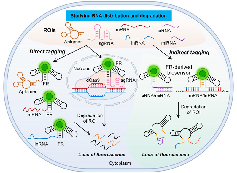 文章其次指出荧光RNA技术可以助力RNA药物研发。在药学研究中,FR和FRB可用于细胞内RNA药物的药代动力学和药效学研究,以及通过构建工程化RNA支架和RNA纳米载体用于稳定和递送RNA药物。在这些应用中,FR或FRB的荧光信号可指示RNA药物的分布和降解情况、评估RNAi的干扰效率、mRNA分子的翻译活性以及RNA适配体的靶向效率等。这对于理解致病性RNA和RNA药物的折叠、代谢动力学和亚细胞定位至关重要。同时,基于FR和FRB精确的药代动力学与药效学分析、药物疗效评估和治疗监测方案,可帮助临床医生优化药物剂量、最小化副作用并提高治疗效果。