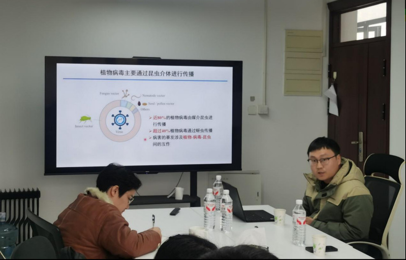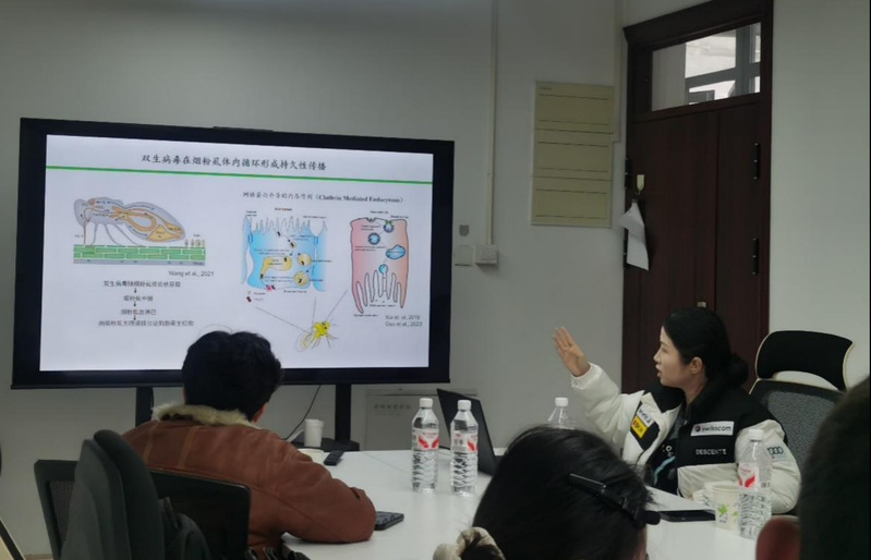 王韵婧以《双生病毒诱导植物自噬调控病毒传播的机制》为题作了学术报告。她围绕双生病毒的传播特性,深入探讨了双生病毒在植物与媒介昆虫间传播的调控机制,揭示了病毒蛋白与自噬系统之间的相互作用。该研究成果为理解病毒在双宿主环境中的适应机制提供了新视角,也为探索病毒传播阻断的新方法提供了理论依据。